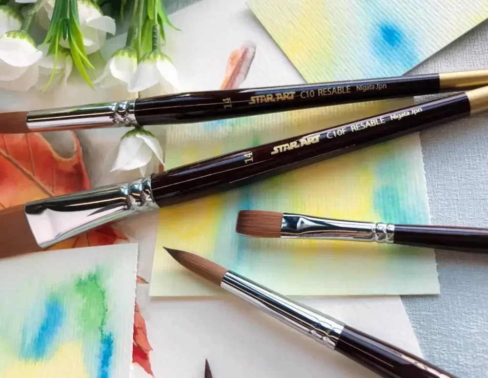 - Washi Brush: These come in a variety of shapes, including flat washi brushes, mop brushes, and oval washi brushes. They are used to wet large areas of paper with water or paint. Some shapes can also be used to draw interesting shapes.